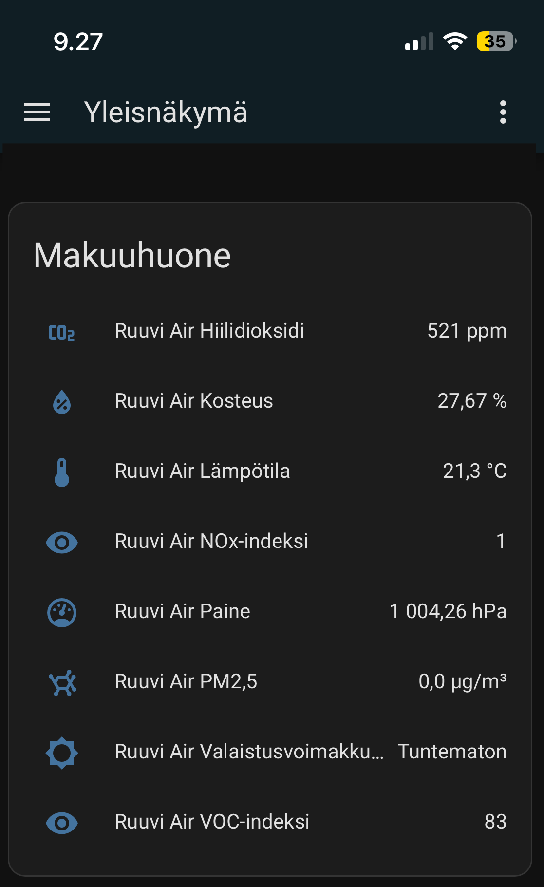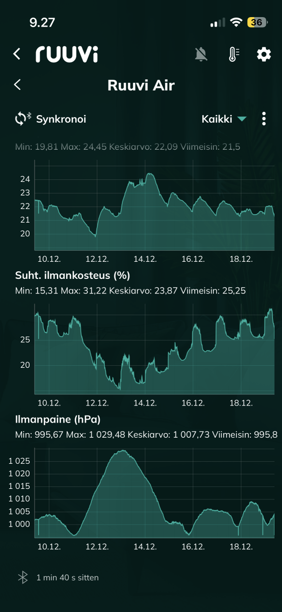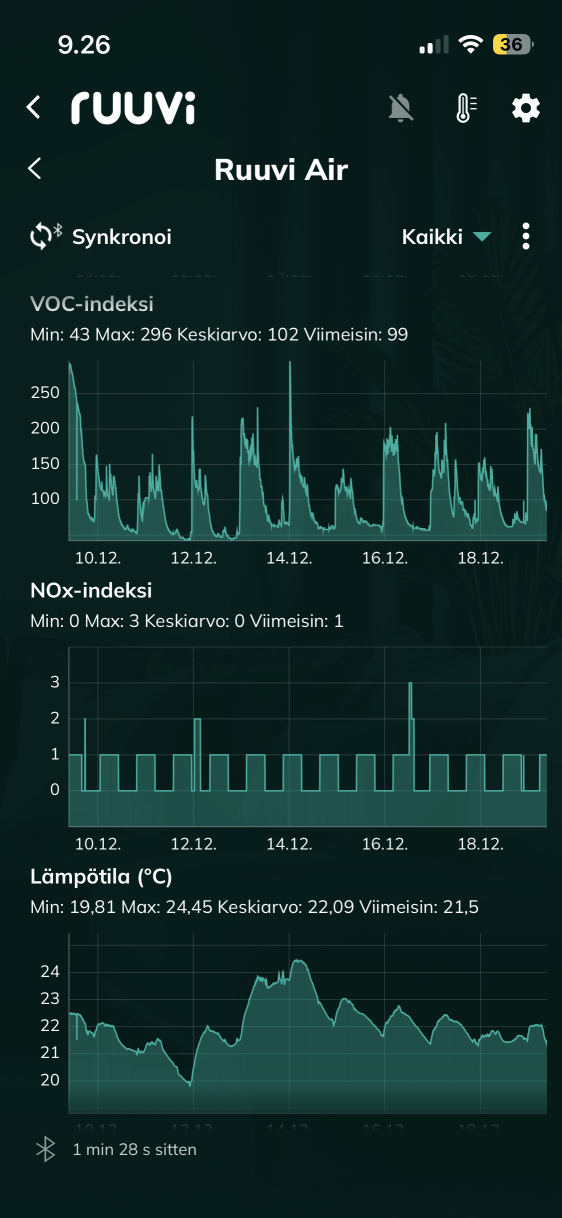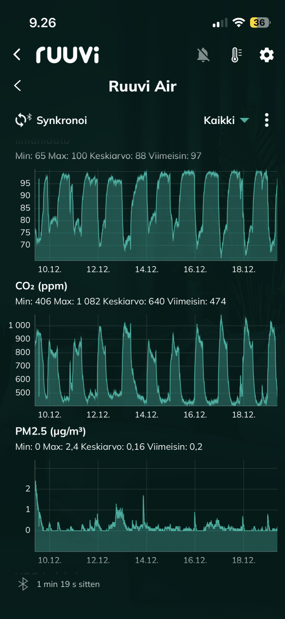 Minulla on Ruuvi Air kytkettynä Home Assistantiin ja siellä tiedot päivittyvät n. 10 s välein ja data vaikutaa validilta. Eli homma toimii ja arvot ovat lähellä viereisen olohuoneen Ruuvi Tagin arvoja soveltuvilta osin. Sen sijaan puhelimen appilla Airin tiedot näyttävät jatkuvasti kummallisilta ja eivät mielestäni vastaa todellisuutta. Samoin anturikortti ei tunnu päivittyvän. Esim. ilmanlaatu on aina 97, jota se oli myös anturin käyttöönotossa. Muutkaan arvot eivät vastaa nykyhetkeä. Melkein voisin väittää, ettei anturikortti ole päivittynyt laisinkaan sitten ensiyhteyden/käyttöönoton. Sen sijaan anturidata välilehdellä näkyy uskottavaa anturidatan syklausta, koska anturi sijaitsee makuuhuoneessa, ja yön aikana ilmanlaatu lähtee heikkenemään. Vaatii tosin synkronointi napin painamista, jotta datanäkymä päivittyy sitten edelisen yhteyden jälkeen.